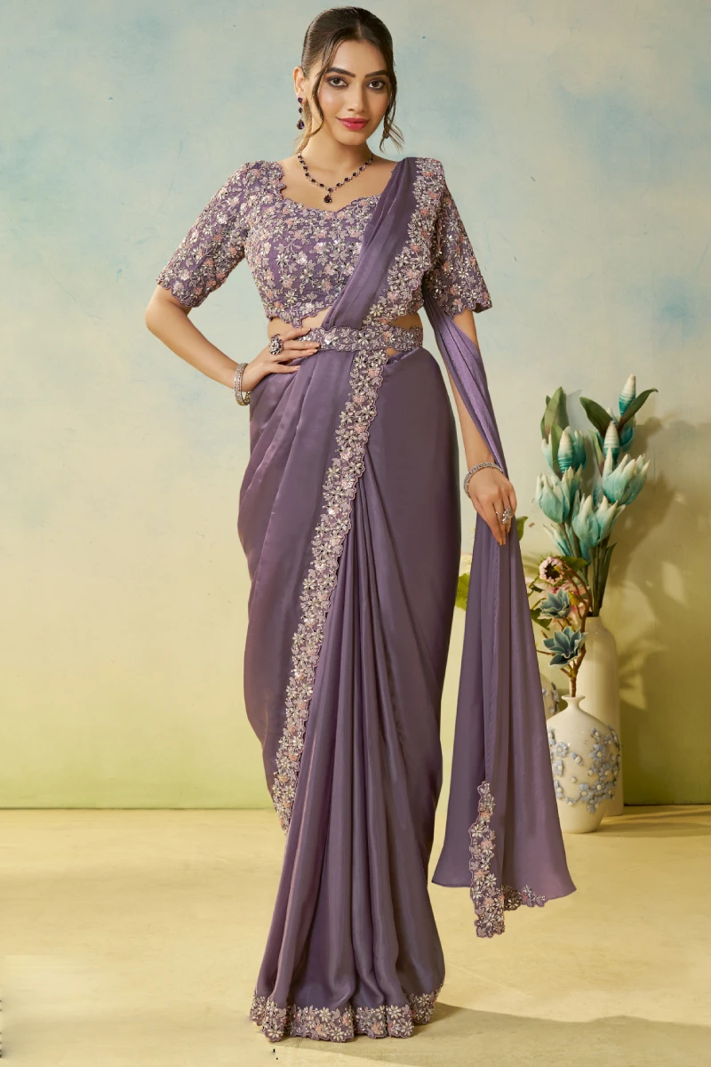 Dusky Magenta Heavy Embroidered Ready To Wear Saree