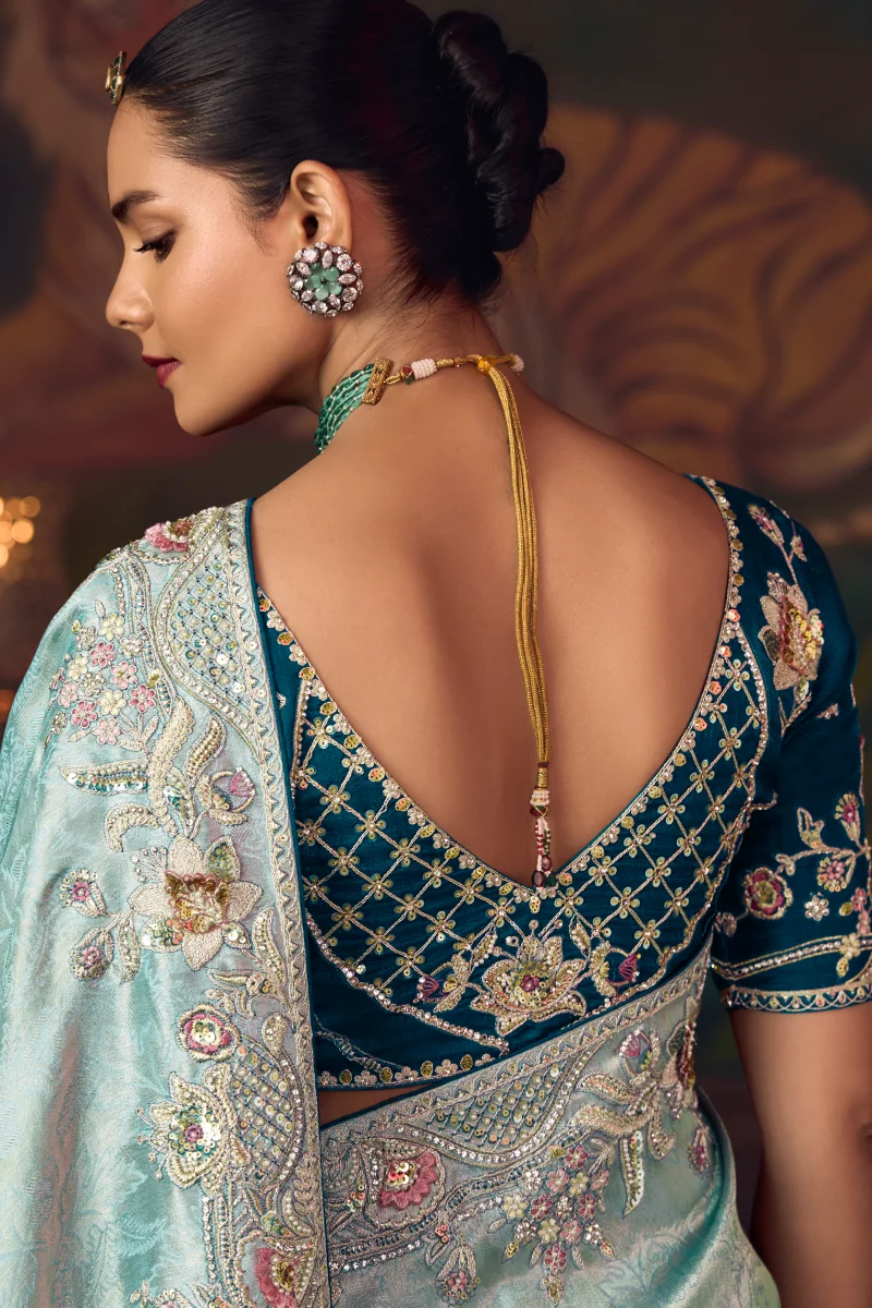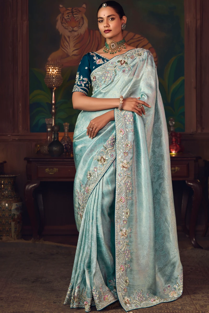 8 reviews for Light Blue Heavy Embroidered Silk Ready to Wear Saree