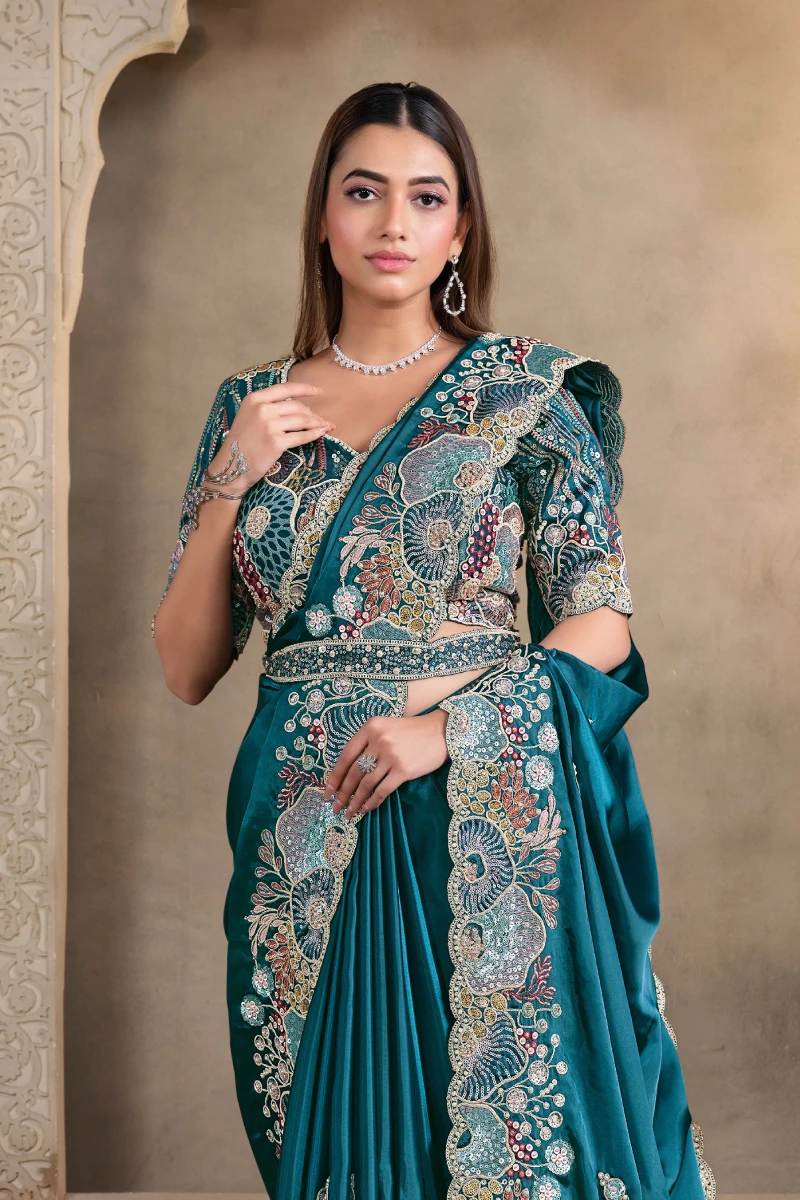 Teal Blue Satin Silk Heavy Work One Minute Saree